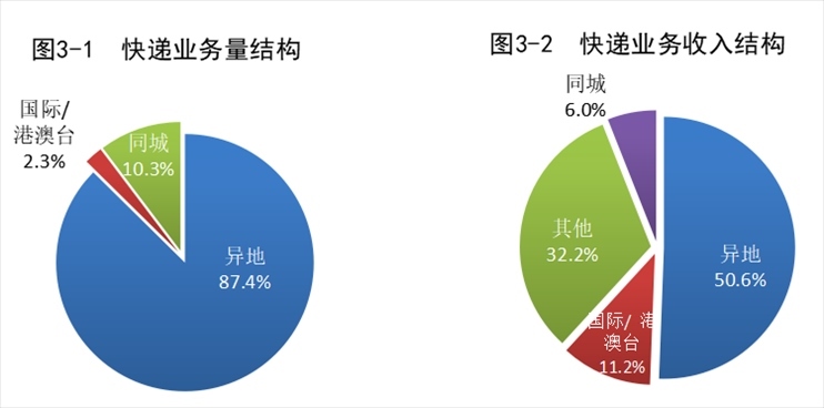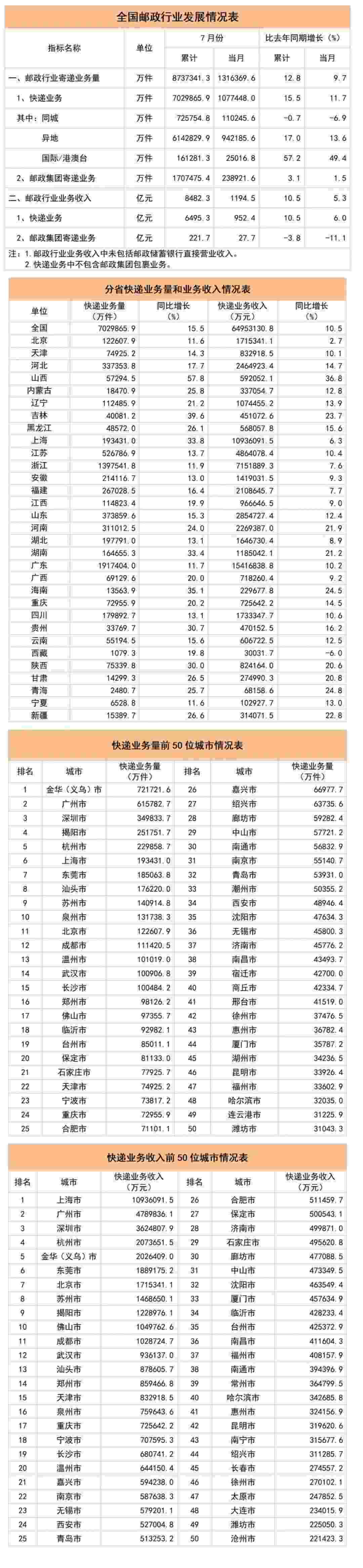 1-7月,郵政行業(yè)業(yè)務(wù)收入(不包括郵政儲(chǔ)蓄銀行直接營業(yè)收入)累計(jì)完成8482.3億元,同比增長10.5%。其中,快遞業(yè)務(wù)收入累計(jì)完成6495.3億元,同比增長10.5%。7月份,郵政行業(yè)寄遞業(yè)務(wù)量完成131.6億件,同比增長9.7%。其中,快遞業(yè)務(wù)量完成107.7億件,同比增長11.7%。7月份,郵政行業(yè)業(yè)務(wù)收入完成1194.5億元,同比增長5.3%。其中,快遞業(yè)務(wù)收入完成952.4億元,同比增長6.0%。1-7月,同城、異地、國際/港澳臺快遞業(yè)務(wù)量分別占全部快遞業(yè)務(wù)量的10.3%、87.4%和2.3%;業(yè)務(wù)收入分別占全部快遞收入的6.0%、50.6%和11.2%。與去年同期相比,同城快遞業(yè)務(wù)量的比重下降1.7個(gè)百分點(diǎn),異地快遞業(yè)務(wù)量的比重上升1.1個(gè)百分點(diǎn),國際/港澳臺業(yè)務(wù)量的比重上升0.6個(gè)百分點(diǎn)。