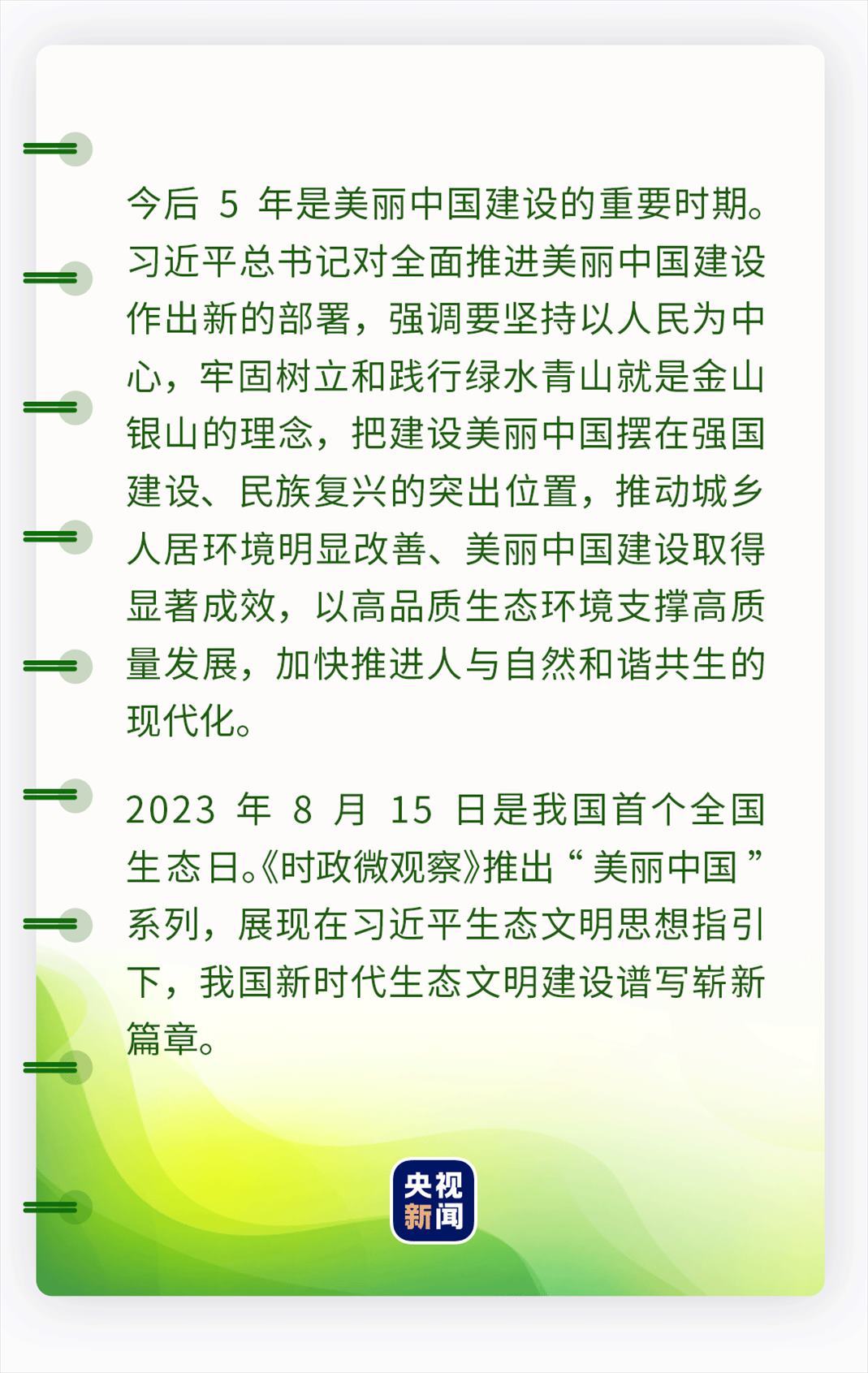 習(xí)近平希望全社會(huì)行動(dòng)起來,做綠水青山就是金山銀山理念的積極傳播者和模范踐行者,身體力行、久久為功,為共建清潔美麗世界作出更大貢獻(xiàn)。