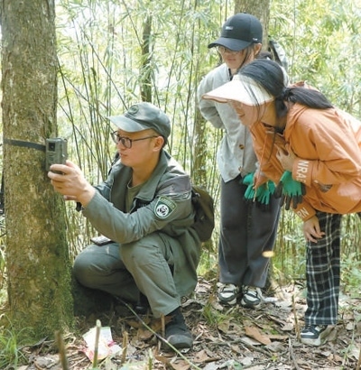 四川大相嶺大熊貓野化放歸研究基地巡護員在安裝調試紅外線相機。楊愛玲攝