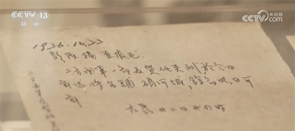 六盤山紅軍長征紀(jì)念館館長 李玲:在我們紀(jì)念館里也陳列展出了一組非常珍貴的、紅軍長征過程當(dāng)中的電文,其中有一張就是1936年10月22日,您看在這里,這個(gè)日子也是紅一和紅二方面軍在西吉將臺(tái)堡勝利會(huì)師的日子。