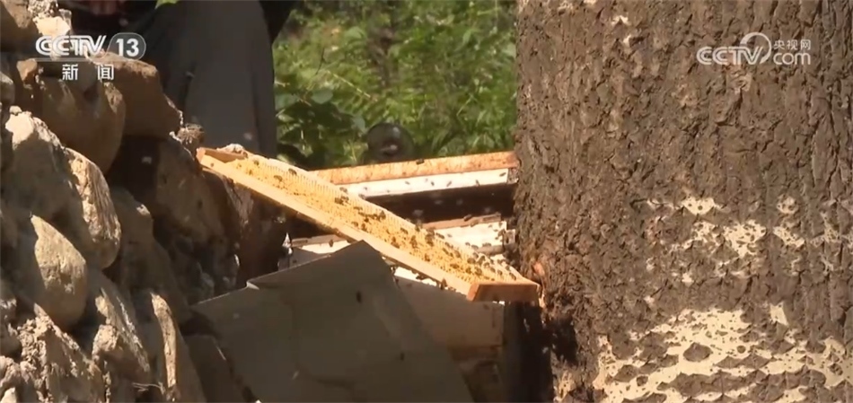 在暴雨災(zāi)害中,泗馬溝村的中華蜂養(yǎng)殖場(chǎng)的一些蜂箱進(jìn)水,蜂王帶著蜂群飛到附近的樹洞里或樹杈上。蜂農(nóng)們用煙熏的方式將蜜蜂從樹洞中熏出來(lái),再用巢脾將它們誘接回養(yǎng)殖蜂箱內(nèi)。目前,絕大部分被暴雨沖散的蜂群已被找回。