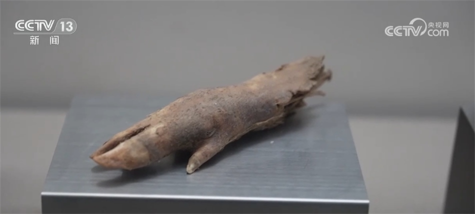 嘉峪關(guān)市紅領(lǐng)巾講解員 辛宇軒:這個是漢代豬蹄,是守衛(wèi)邊疆士卒們留下來的遺存之物,距今2000余年,是極為難得的長城文物。我們可以看得出來,它的骨架、腳趾保存都是相對完好的,這是野豬的豬蹄,我們這邊氣候干燥,所以就不會把它給腐蝕掉。