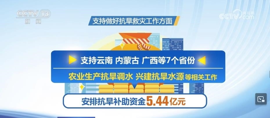 在支持做好抗旱救災(zāi)工作方面,安排抗旱補助資金5.44億元,支持云南、內(nèi)蒙古、廣西等7個省份,開展農(nóng)業(yè)生產(chǎn)抗旱調(diào)水、興建抗旱水源等相關(guān)工作。 ?