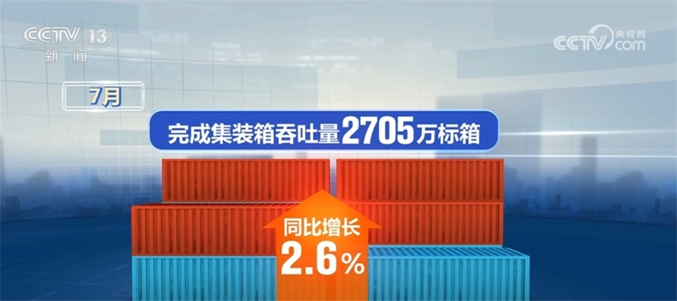 7月,全國港口貨物吞吐量達14.3億噸,同比增長6.6%,其中,內(nèi)、外貿(mào)吞吐量同比分別增長5.8%和8.5%。完成集裝箱吞吐量2705萬標箱,同比增長2.6%。