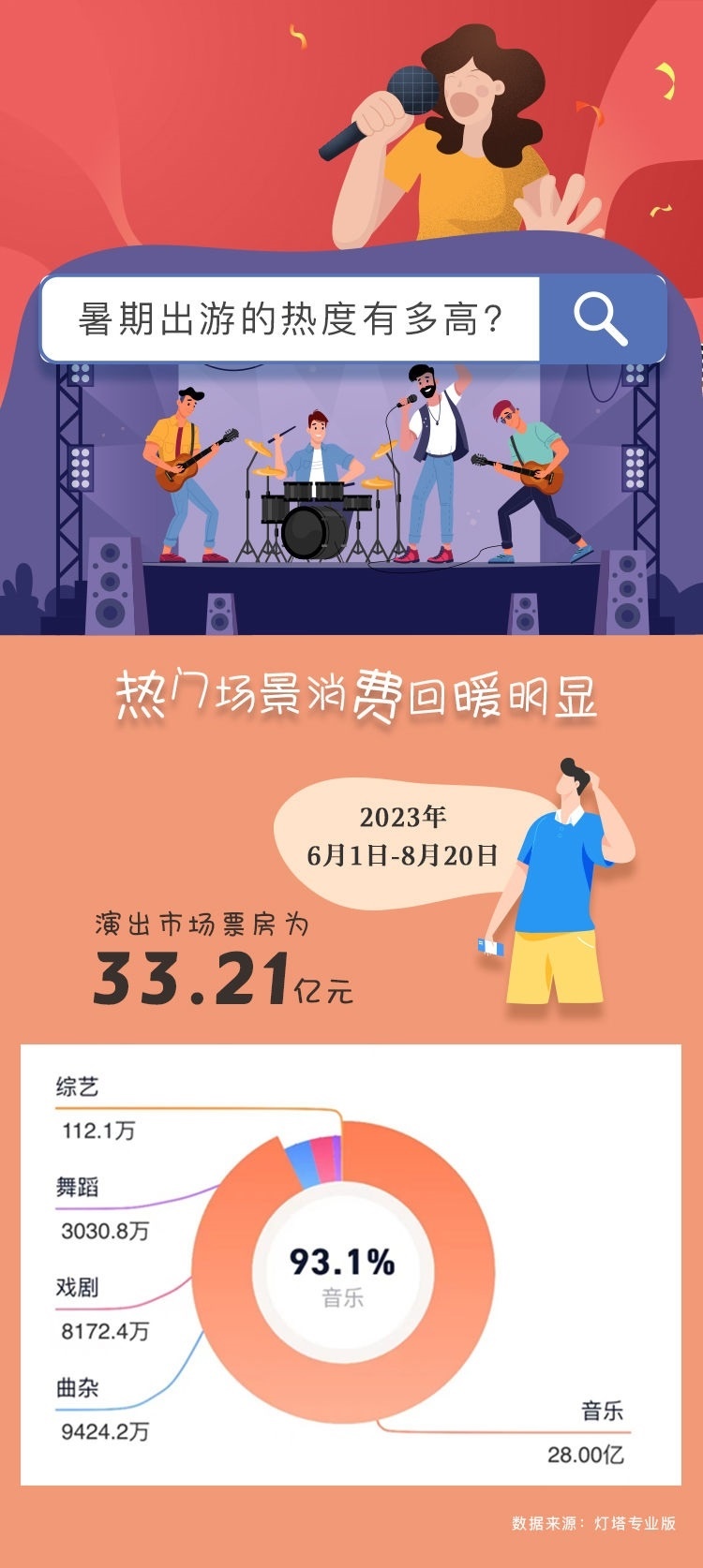 作為演出市場的傳統(tǒng)旺季,暑假期間演唱會、Live house、戲劇、音樂劇等各類熱門演出“一票難求”。根據(jù)燈塔專業(yè)版最新數(shù)據(jù),暑期檔中的6月1日至8月23日演出市場票房已經(jīng)超過30億元,而相當可觀的跨城觀演比例,更引得除了演出票房之外的周邊產(chǎn)業(yè)一起火?!耙粋€演出圈粉一座城”,當?shù)芈糜谓?jīng)濟不斷涌現(xiàn)新的可能。