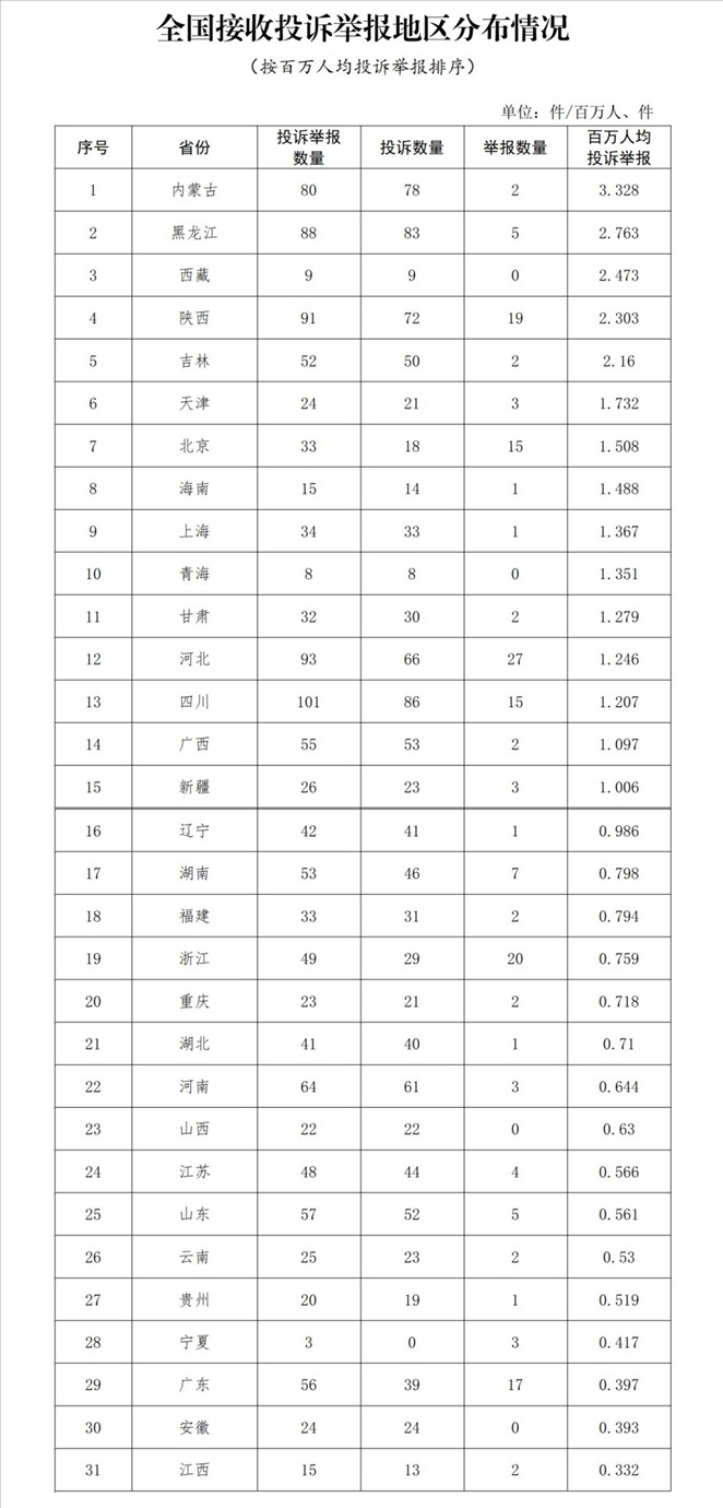 各?。ㄗ灾螀^(qū)、直轄市)按照接收投訴舉報(bào)數(shù)量排序,四川、河北、陜西、黑龍江、內(nèi)蒙古排在全國(guó)前5位。其中:按投訴數(shù)量排序,四川、黑龍江、內(nèi)蒙古、陜西、河北排在全國(guó)前5位;按舉報(bào)數(shù)量排序,河北、浙江、陜西、廣東、北京(四川并列)排在全國(guó)前5位;按百萬(wàn)人均投訴舉報(bào)數(shù)量排序,內(nèi)蒙古、黑龍江、西藏、陜西、吉林排在全國(guó)前5位。(全國(guó)接收投訴舉報(bào)地區(qū)分布情況詳見(jiàn)附件1)
