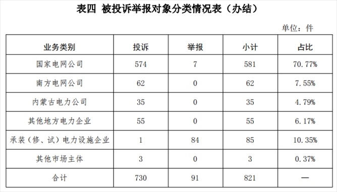 從被投訴舉報(bào)對(duì)象看,供電企業(yè)733件、占投訴舉報(bào)總數(shù)的89.28%,其中國(guó)家電網(wǎng)公司581件、占比70.77%,南方電網(wǎng)公司62件、占比7.55%,內(nèi)蒙古電力公司35件、占比3.65%,其他地方電力企業(yè)55件、占比6.17%;承裝(修、試)電力設(shè)施企業(yè)85件、占比10.35%;其他市場(chǎng)主體3件、占比0.37%。