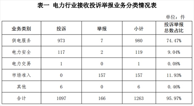 電力行業(yè)排在首位,數(shù)量為1263件、占投訴舉報(bào)總數(shù)的95.97%,主要集中在供電服務(wù)、市場(chǎng)準(zhǔn)入、電力安全等方面。