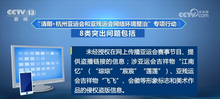 未經(jīng)授權(quán)在網(wǎng)上傳播亞運(yùn)會(huì)賽事節(jié)目、提供盜播鏈接的信息;涉亞運(yùn)會(huì)吉祥物“江南憶”(“琮琮”“宸宸”“蓮蓮”)、亞殘運(yùn)會(huì)吉祥物“飛飛”、會(huì)徽等形象標(biāo)志和美術(shù)作品的侵權(quán)盜版信息。