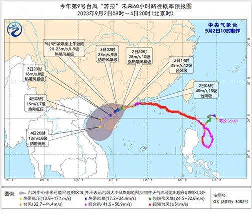 降水預(yù)報:9月2日14時至3日14時,受“蘇拉”和“??庇绊?,廣東西南部、廣西東南部、福建東北部沿海、臺灣島東部等地有大到暴雨,其中,廣東西南部、臺灣島東部等地部分地區(qū)有大暴雨(100~220毫米)。