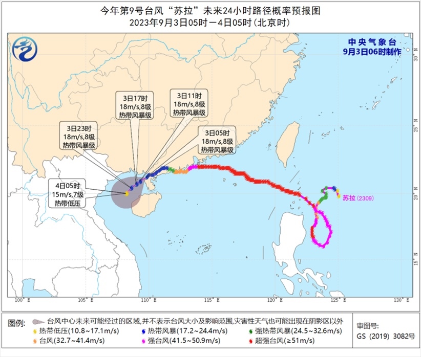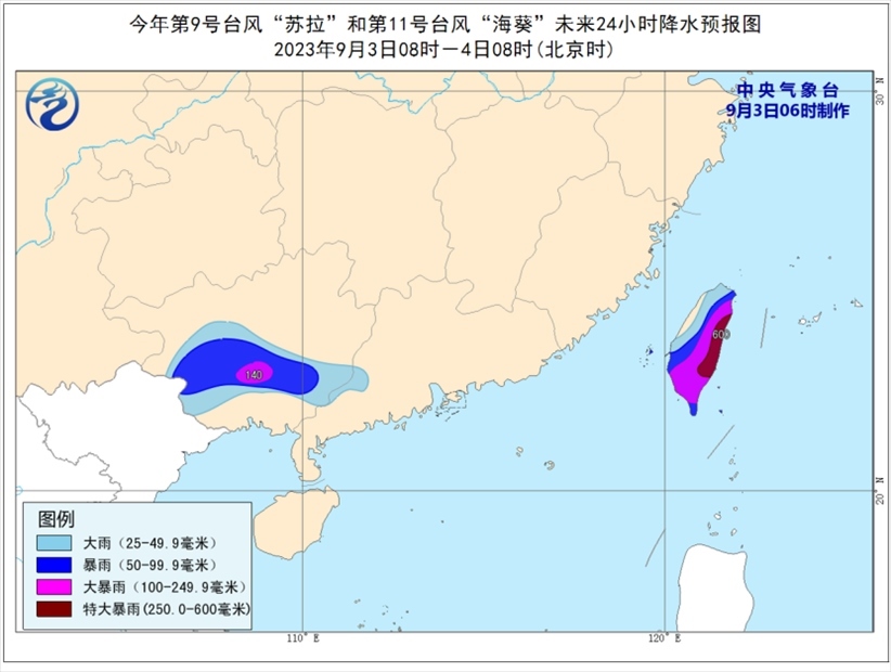 降水預(yù)報(bào):9月3日08時(shí)至4日08時(shí),受“蘇拉”和“??庇绊懀瑥V西中南部、廣東西南部、臺(tái)灣島等地部分地區(qū)有大到暴雨,其中,廣西中南部、臺(tái)灣島中東部等地部分地區(qū)有大暴雨,臺(tái)灣島東部部分地區(qū)有特大暴雨(250-600毫米)。