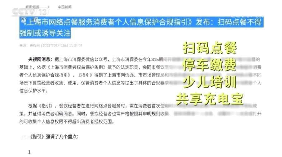 為了加強個人信息保護,上海市消保委自7月起針對掃碼點餐、停車?yán)U費、少兒培訓(xùn)和共享充電寶等四種消費場景,分別出臺了合規(guī)指引、自律承諾和合規(guī)清單。未來,還將針對房產(chǎn)中介、商超購物等主要消費場景作出相應(yīng)指引。