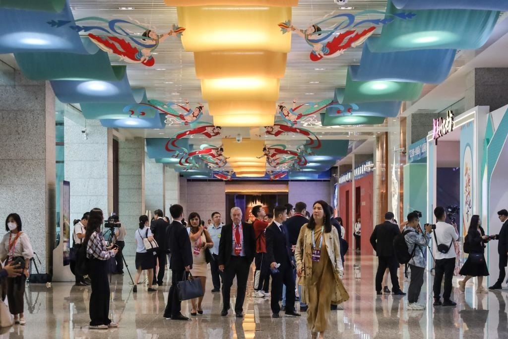 9月6日,與會嘉賓在第六屆絲綢之路(敦煌)國際文化博覽會上參觀文創(chuàng)產(chǎn)品和文旅裝備展銷活動(dòng)。新華社記者 馬希平 攝