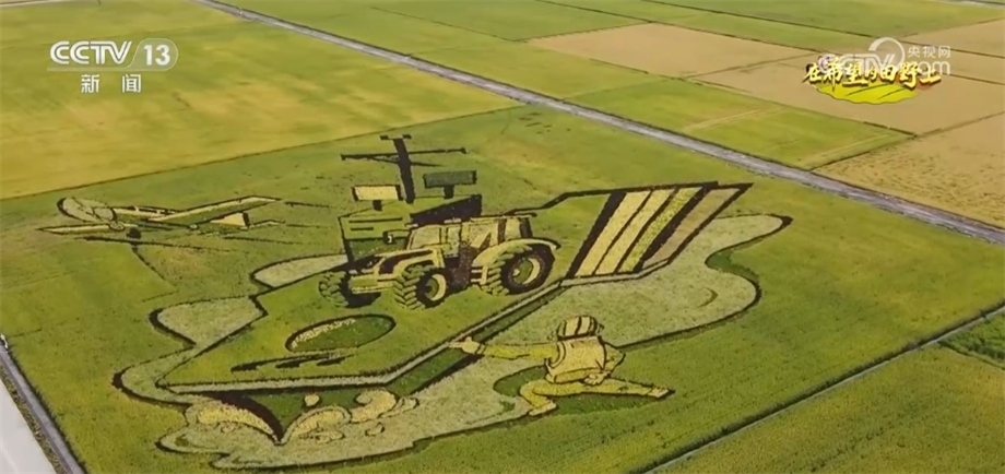 總臺央視記者 蔣樹林:金秋9月的稻田是什么顏色的?9月的稻香又是什么味道?來這里,有可能會找到您想要的答案。我現(xiàn)在是在黑龍江北大荒閆家崗農(nóng)場。大家來看,這個稻田觀景臺有十多米高,因此站在這里,秋日稻田大片的圖案映入眼簾,今年稻田畫以“鄉(xiāng)村振興”“數(shù)字農(nóng)業(yè)”為主題,生動展現(xiàn)了“讓農(nóng)業(yè)更美好、讓農(nóng)民更幸福”的美好愿景。稻田畫是農(nóng)民們勤勞與智慧的展現(xiàn),他們用稻田畫為家鄉(xiāng)水稻代言,而對于在黑土地打拼的北大荒人而言,還有更重要的意義。
