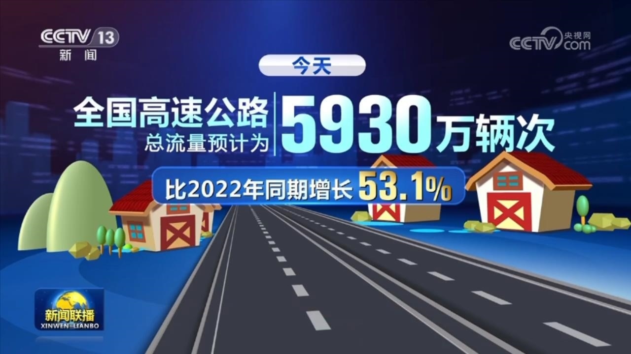 今天,全國(guó)高速公路總流量預(yù)計(jì)為5930萬(wàn)輛次,比2022年同期增長(zhǎng)53.1%。