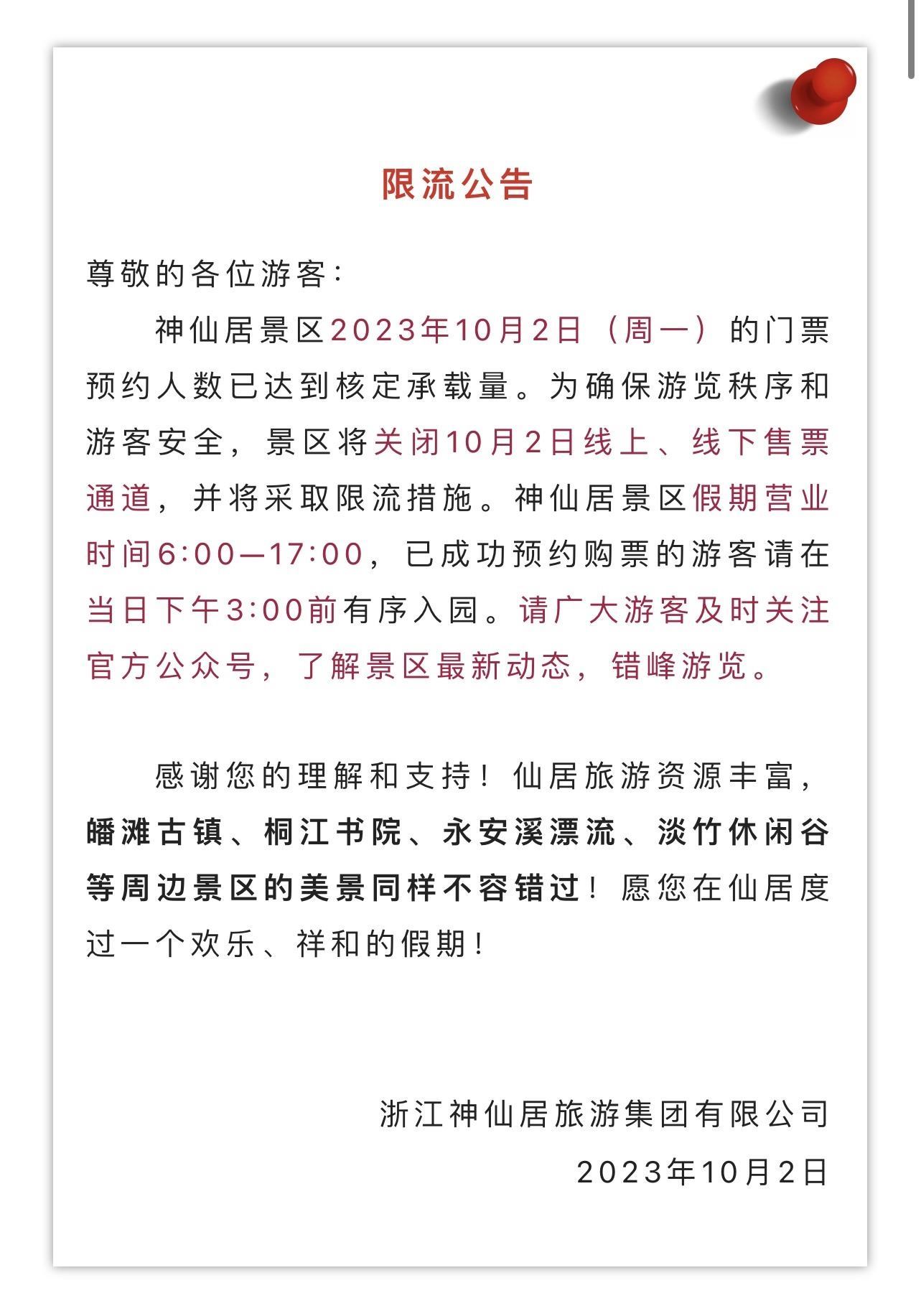 臺州神仙居景區(qū)于10月2日零點就發(fā)布當日門票已約滿的消息。