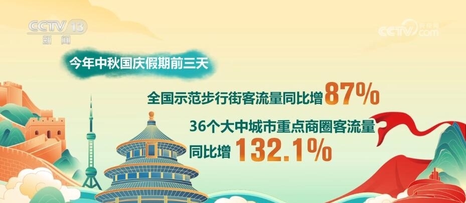 商務(wù)部數(shù)據(jù)顯示,假期前三天,重點商圈人氣紅火。全國示范步行街客流量同比增長87%,36個大中城市重點商圈客流量同比增長132.1%。
