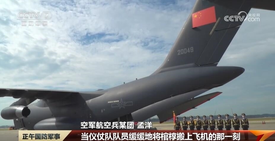 空軍航空兵某團 孟洋:當時在儀式的現(xiàn)場,我們機組成員是列隊在飛機的后艙位置,準備迎接烈士遺骸上飛機。當儀仗隊隊員緩緩地將棺槨搬上飛機的那一刻,我看著一面面國旗覆蓋在棺槨上,直到那一刻,我才更加深刻地理解我們國旗的顏色是由無數(shù)革命先烈鮮血染成的。