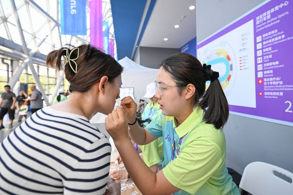 9月26日,浙江杭州淳安界首體育中心自行車館場館志愿者為前來觀賽的觀眾貼上加油助威貼紙。新華社記者 胡虎虎 攝