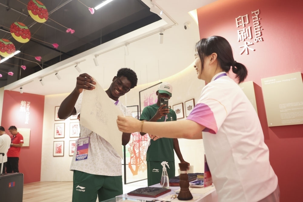9月29日,沙特阿拉伯運動員穆罕默德·杜海姆·穆阿維(左)在亞運村體驗雕版印刷。新華社記者 胡星宇 攝