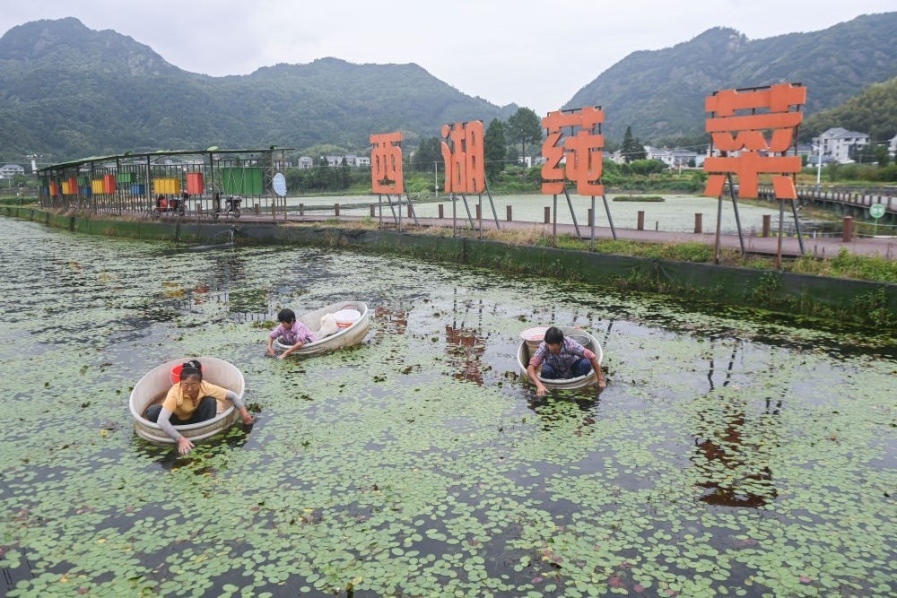 9月5日,在浙江省建德市航頭鎮(zhèn)烏龍村莼菜基地,村民劃著“盆船”在西湖莼菜產(chǎn)業(yè)園種植基地的水面上采摘西湖莼菜。近年來,浙江建德市航頭鎮(zhèn)以黨建聯(lián)建為紐帶,圍繞轄區(qū)特色農(nóng)業(yè)產(chǎn)業(yè)園建設(shè),發(fā)揮新鄉(xiāng)賢、鄉(xiāng)土人才、農(nóng)創(chuàng)客作用,在烏龍村投資600余萬元新建了占地1900平方米的西湖莼菜產(chǎn)業(yè)園,引導(dǎo)新鄉(xiāng)賢爭當(dāng)農(nóng)業(yè)致富帶頭人,打造西湖莼菜共富工坊。新華社記者 徐昱 攝
