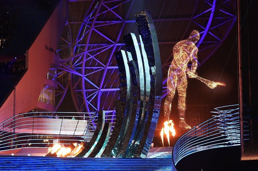 9月23日,數(shù)字火炬手在點燃主火炬。新華社記者 劉續(xù) 攝