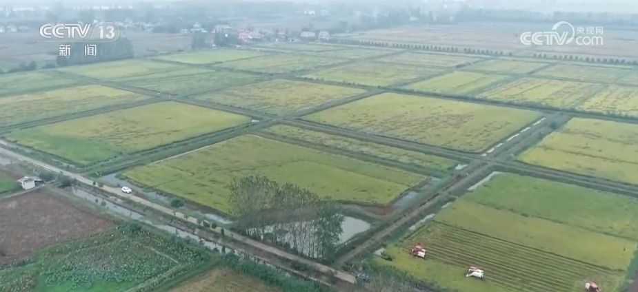 在湖南省常德市鼎城區(qū),連片的中稻迎來豐收。種糧大戶陳元普調度了3臺收割機前來搶收,很快30多畝稻田就完成了收割。