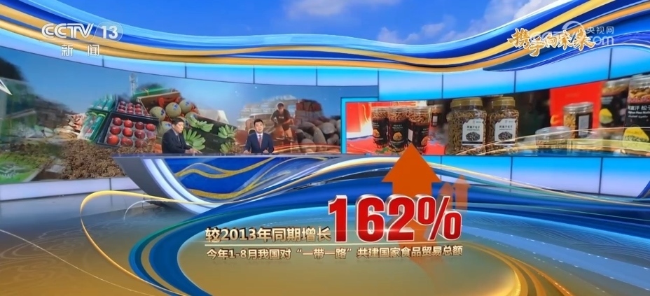 162%。2023年1—8月,我國對“一帶一路”共建國家食品貿(mào)易總額已經(jīng)達到5538.2億元,較2022年同期增長10.4%,較2013年同期增長達到了162%。