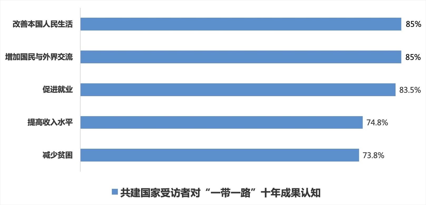 “一帶一路”倡議下一個個“惠而實(shí)”的民生工程、民心工程,為各國人民帶來實(shí)實(shí)在在的獲得感、幸福感和安全感,85%的共建國家受訪者認(rèn)為“一帶一路”切實(shí)改善了本國人民的生活;85%的共建國家受訪者認(rèn)為通過“一帶一路”民眾獲得了更多與外界交流互鑒的機(jī)會;分別有83.5%、74.8%和73.8%的共建國家受訪者認(rèn)可共建“一帶一路”在促進(jìn)就業(yè)、提高居民收入水平和減少貧困方面的作用;86.5%的共建國家受訪者認(rèn)為“一帶一路”倡議和“以人民為中心”的理念高度契合,惠及全球民眾的愿景正在逐步變?yōu)楝F(xiàn)實(shí)。