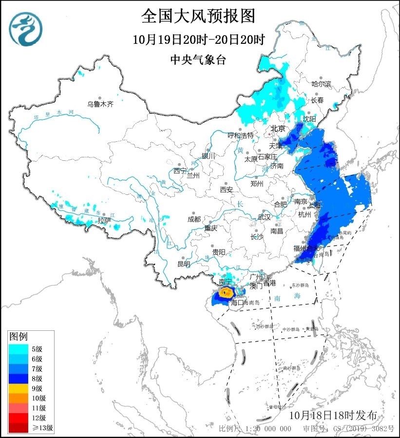 10月19日20時(shí)至20日20時(shí),南海西北部海域、北部灣、瓊州海峽將有6~8級(jí)、陣風(fēng)9級(jí)的大風(fēng),其中北部灣的部分海域風(fēng)力可達(dá)9~10級(jí),陣風(fēng)11~12級(jí)。渤海、渤海海峽、黃海大部海域、東海大部海域、臺(tái)灣海峽將有7~8級(jí)、陣風(fēng)9級(jí)的大風(fēng)。內(nèi)蒙古中東部、遼寧南部和西部、廣西南部沿海等地將有5~6級(jí)、陣風(fēng)7~8級(jí)的大風(fēng)。