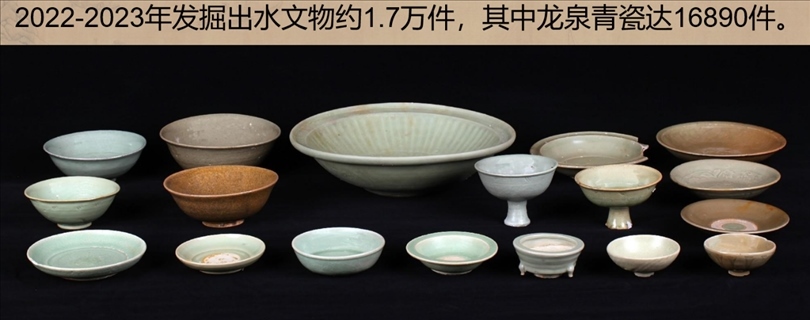 發(fā)掘出水文物標(biāo)本約1.7萬(wàn)件,主要為龍泉青瓷和陶罐、鉛錘、印章等船上生活、航海相關(guān)文物。其中龍泉青瓷數(shù)量達(dá)到1.6萬(wàn)余件,器形包括碗、盤(pán)、碟、盞、洗、缽、香爐和高足杯等,年代為元代晚期,為典型的外銷(xiāo)貿(mào)易瓷。結(jié)合溫州朔門(mén)古港的考古發(fā)現(xiàn),推測(cè)該沉船可能是從溫州港出海前往東南亞的民間貿(mào)易商船。