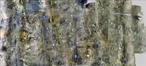 經(jīng)過(guò)調(diào)查,探明了一號(hào)、二號(hào)沉船遺址的分布范圍,在二處遺址核心堆積區(qū)的西南角布放水下測(cè)繪永久基點(diǎn),完成了遺址三維激光掃描和一號(hào)沉船遺址核心區(qū)、環(huán)形散落區(qū)、部分條形散落區(qū)和二號(hào)沉船遺址核心區(qū)、散落區(qū)的攝影拼接,從一號(hào)沉船遺址提取出水文物標(biāo)本543件(套),二號(hào)沉船遺址提取出水遺物36件。