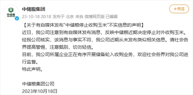 ·中儲糧集團(tuán)辟謠停止收購玉米:近期從未發(fā)布類似相關(guān)信息。