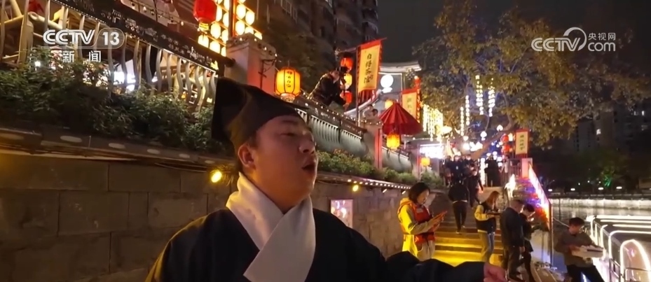 夜幕降臨,華燈初上,在成都東門碼頭,身穿漢服的演員或是在點(diǎn)茶待客,或是在與游客對詩。一曲罷后,游客登上游船,不僅可以欣賞菩提燈光秀,還可以品味曲藝壩壩茶感受優(yōu)雅詩意。