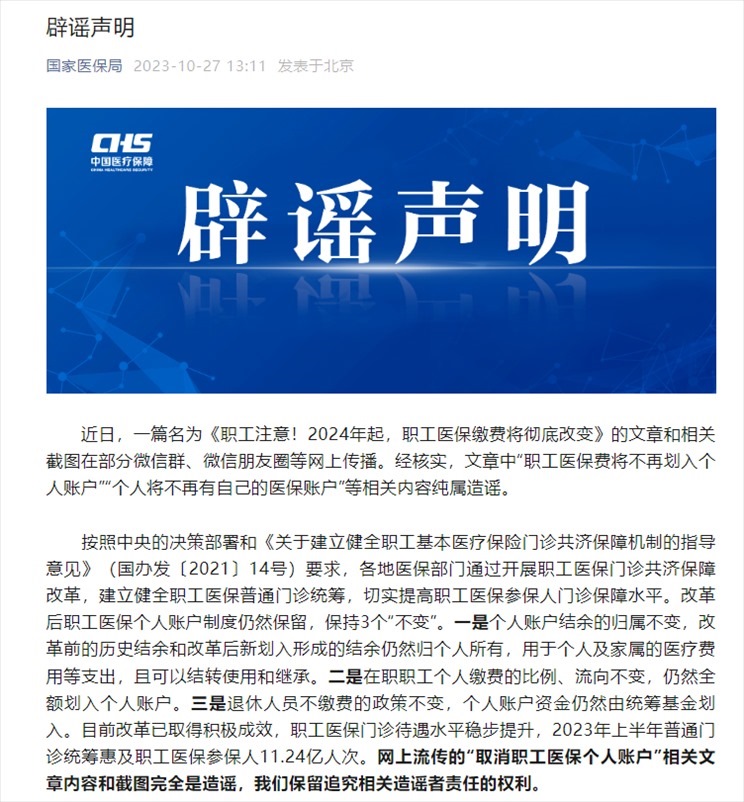·“職工醫(yī)保費將不再劃入個人賬戶”“個人將不再有自己的醫(yī)保賬戶”?國家醫(yī)保局:純屬造謠。