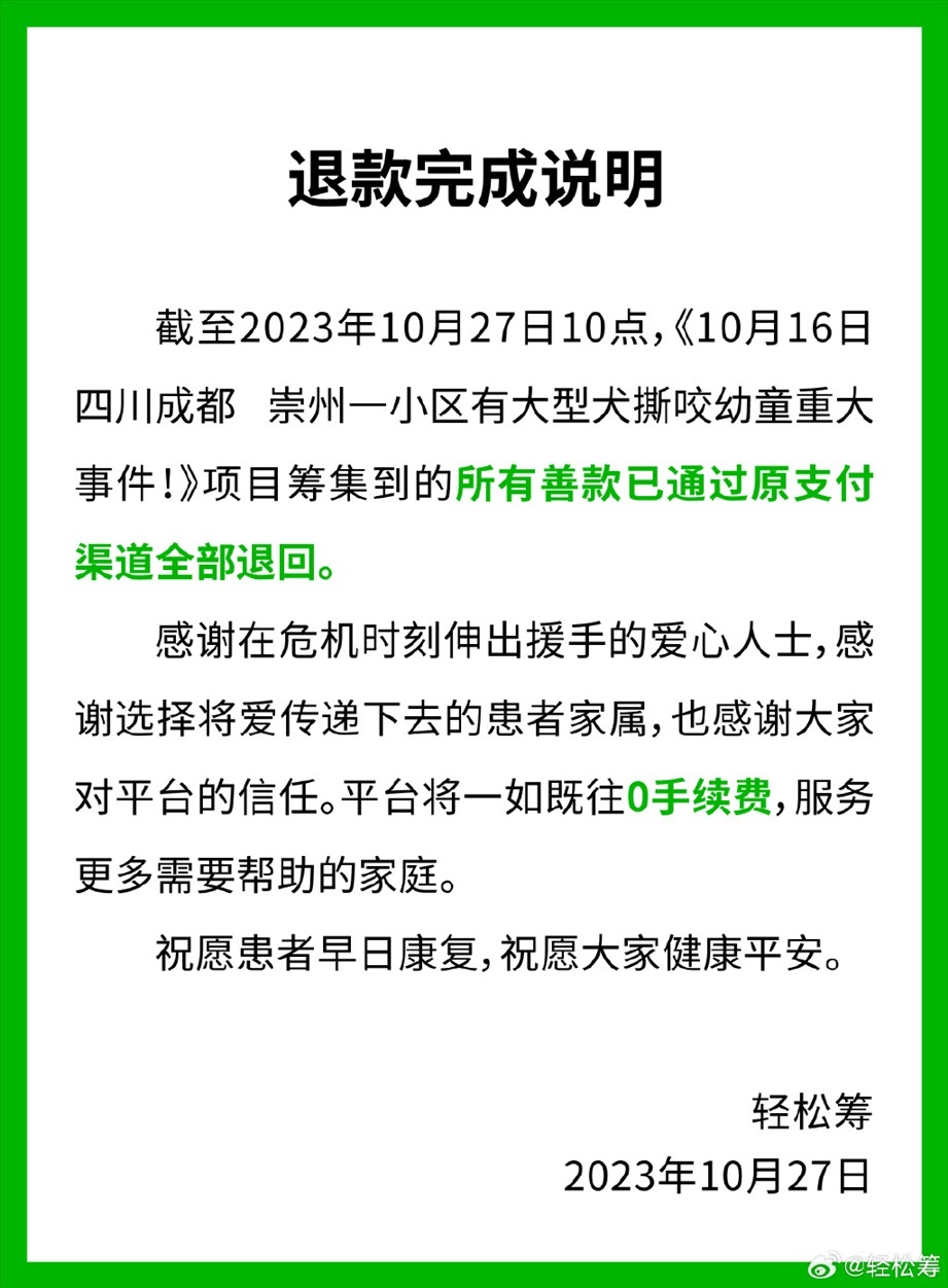 ·輕松籌平臺稱為被狗咬女童籌集的所有善款已全部退回。