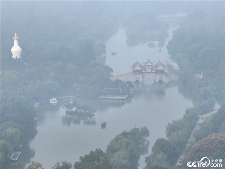 2023年10月27日, 江蘇省揚州市出現(xiàn)大霧天氣,瘦西湖風景區(qū)在霧中若隱若現(xiàn)、如夢似幻,宛若一幅水墨畫。