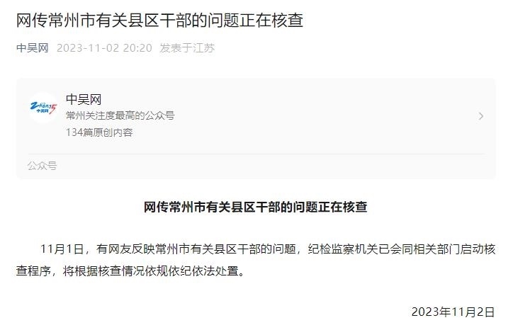 央視網(wǎng)消息:據(jù)“中吳網(wǎng)”微信公眾號(hào)消息,11月1日,有網(wǎng)友反映常州市有關(guān)縣區(qū)干部的問(wèn)題,紀(jì)檢監(jiān)察機(jī)關(guān)已會(huì)同相關(guān)部門(mén)啟動(dòng)核查程序,將根據(jù)核查情況依規(guī)依紀(jì)依法處置。