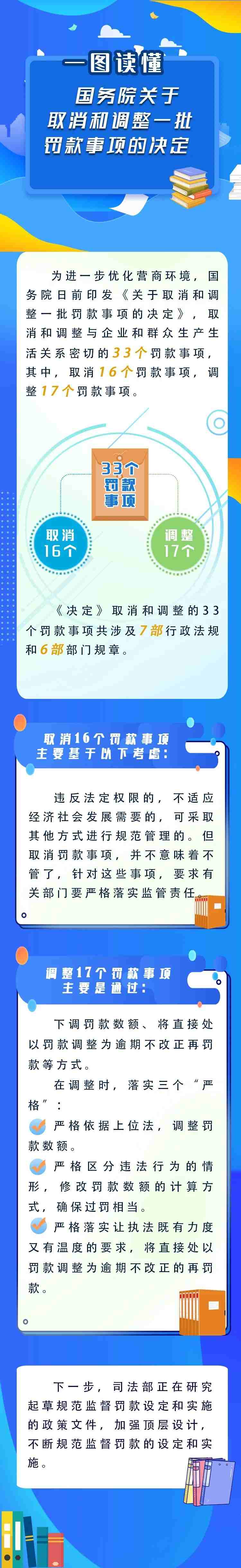 國(guó)務(wù)院日前印發(fā)《關(guān)于取消和調(diào)整一批罰款事項(xiàng)的決定》(以下簡(jiǎn)稱《決定》),取消調(diào)整與企業(yè)和群眾生產(chǎn)生活關(guān)系密切的33個(gè)罰款事項(xiàng)。