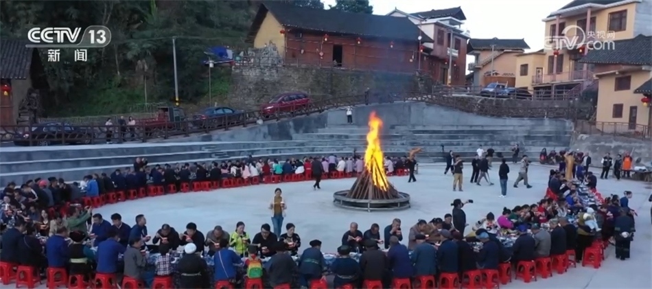 這天是十八洞村一個(gè)重要的日子,村里人聚在一起點(diǎn)起了篝火,擺起了長(zhǎng)龍宴,見(jiàn)證苗家文化廣場(chǎng)投入使用。