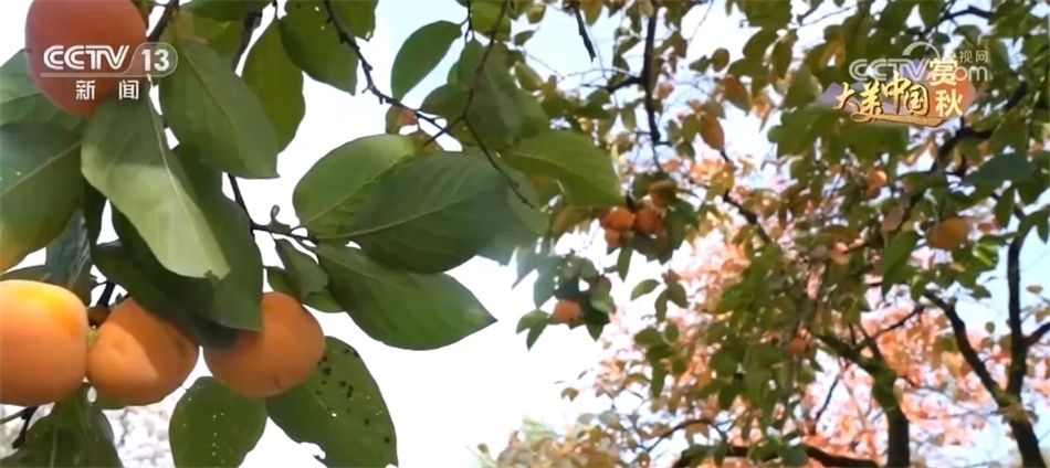 您現(xiàn)在看到的是位于陜西驪山腳下的西安臨潼區(qū)。眼下,這里秋意漸濃,起伏的山巒間,樹樹皆染秋色,不僅染紅了楓葉,也染紅了柿子樹?;鸺t的柿子像一個(gè)個(gè)紅燈籠掛滿了枝頭,透著喜氣,這也是臨潼山間特有的秋韻。