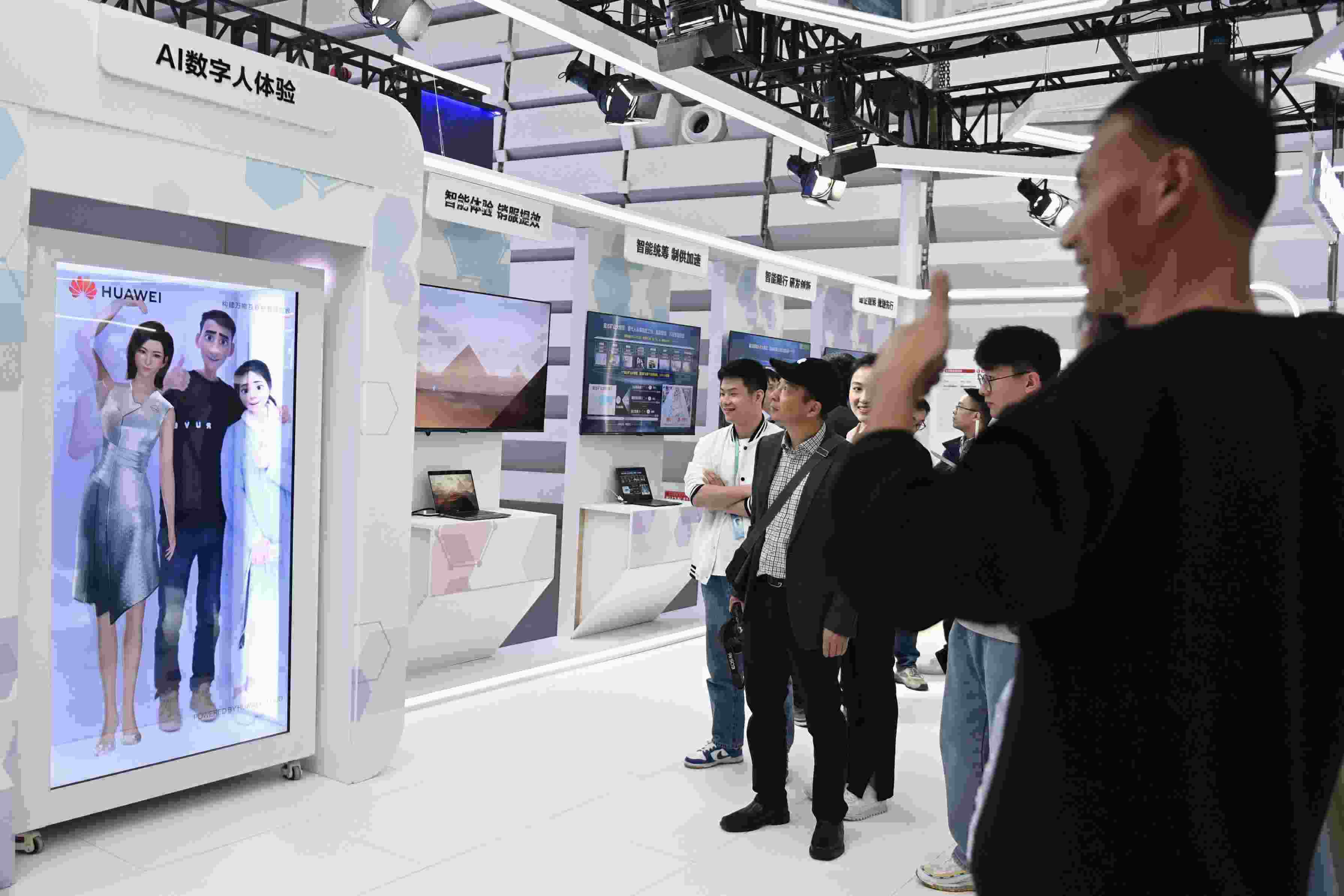 觀眾在華為展臺體驗(yàn)與AI數(shù)字人合影。新華社記者 黃宗治 攝