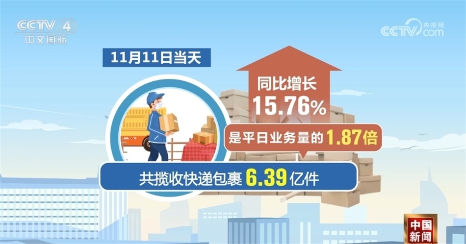 數(shù)據(jù)顯示,11月1日至11日,全國郵政快遞企業(yè)共攬收快遞包裹52.64億件,同比增長23.22%,日均業(yè)務(wù)量是平日業(yè)務(wù)量的1.4倍。其中11月11日當天,共攬收快遞包裹6.39億件,是平日業(yè)務(wù)量的1.87倍,同比增長15.76%。