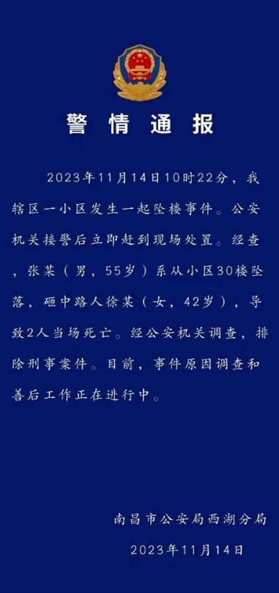 ·南昌警方:男子從小區(qū)30樓墜落砸中女路人,兩人當(dāng)場死亡。
