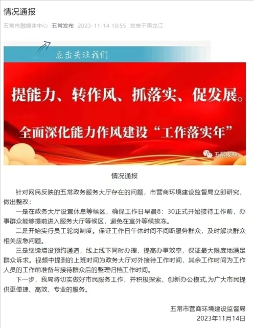 ·黑龍江五常市通報“政務(wù)大廳全天工作6小時”:立即做出整改!