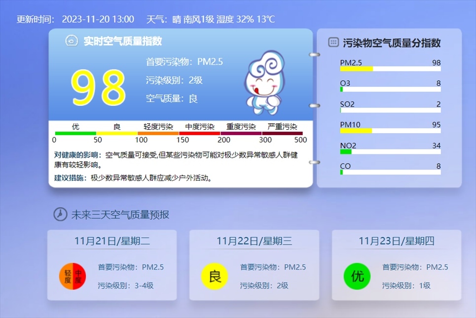 央視網(wǎng)消息:據(jù)@北京環(huán)境監(jiān)測 消息,11月20日13時的實時空氣質量指數(shù),北京目前的污染級別達到2級,東城、西城、朝陽、豐臺、通州、房山、大興等區(qū)已顯示為輕度污染。