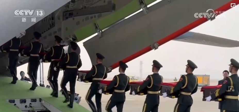 隨后,中方禮兵護(hù)送棺槨走上中國(guó)空軍運(yùn)-20運(yùn)輸機(jī)。北京時(shí)間11月23日上午,運(yùn)-20運(yùn)輸機(jī)從仁川國(guó)際機(jī)場(chǎng)起飛。
