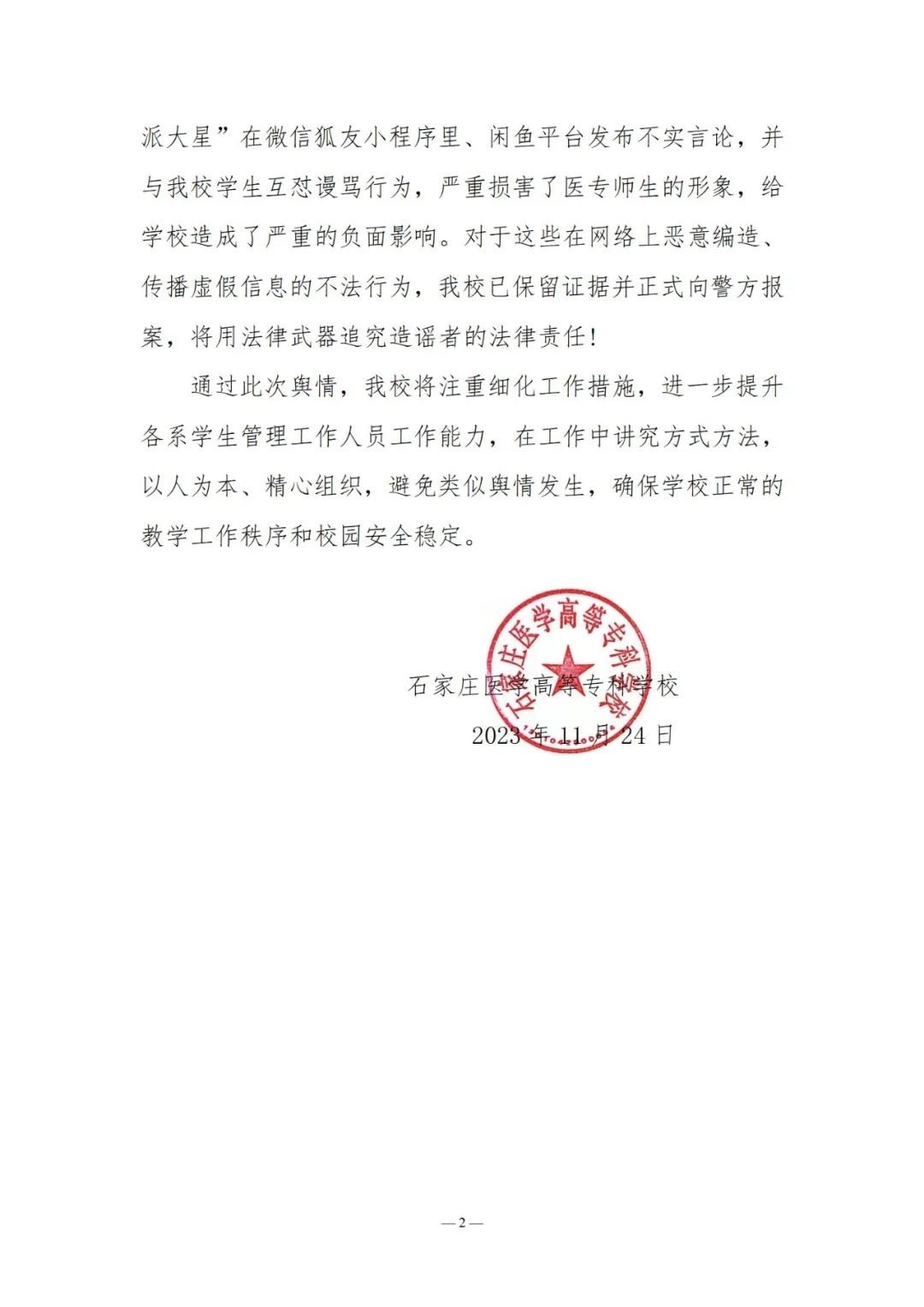 央視網(wǎng)消息:近日,網(wǎng)傳石家莊醫(yī)學(xué)高等專科學(xué)校檢查學(xué)生宿舍,并將沒收來的物品掛在二手平臺咸魚上出售,事件引發(fā)關(guān)注。11月24日,石家莊醫(yī)學(xué)高等??茖W(xué)校發(fā)布聲明稱,22日學(xué)校利用學(xué)生在宿舍時間,排查大功率違規(guī)電器。查獲違規(guī)電器分別由各系登記造表、統(tǒng)一保管,定于放寒假時返還學(xué)生帶回家。經(jīng)核實,網(wǎng)傳短視頻實為學(xué)生準(zhǔn)備去實習(xí)一起收拾房間物品時的視頻,被別有用心人員移花接木、惡意引用。此外,網(wǎng)名為“林北我叫派大星”在微信狐友小程序里、閑魚平臺發(fā)布不實言論,并與學(xué)校學(xué)生互懟謾罵行為,嚴(yán)重?fù)p害了醫(yī)專師生的形象,給學(xué)校造成了嚴(yán)重的負(fù)面影響。學(xué)校已保留證據(jù)并正式向警方報案。