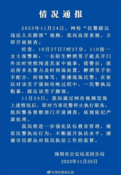 ·深圳龍崗警方通報(bào)“民警踩壓違法人員腳部”:依規(guī)依紀(jì)嚴(yán)肅處理。