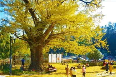 2023年11月25日,安徽安慶,響腸鎮(zhèn)請(qǐng)水寨村千年銀杏樹(shù)披“金甲”,進(jìn)入最佳觀賞期,吸引游客前來(lái)游玩賞景。